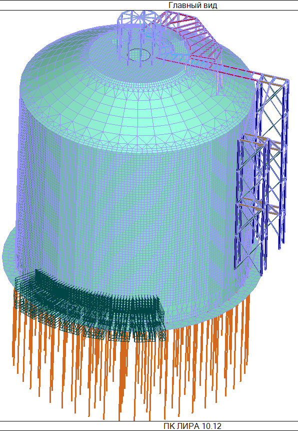 Характерной особенностью модели является сложная конфигурация плиты покрытия с различными деталями в монолитном исполнении. Жесткости конечных элементов были приняты с учетом максимально адаптивной схематизации проектных решений. Днище-ростверк разделено на три различные по толщине зоны с самостоятельными схемами армирования. Стены сооружения разделены на три зоны с различным армированием, что позволяет подобрать экономически обоснованное и механически надежное армирование. Элементы стальных конструкций включены в расчетную схему с фактическими жесткостями, соответствующими выбранным поперечным сечениям металлопроката. Конструктивные решения и армирование свай соответствуют параметрам, установленным в типовом проекте серии 1.011.1-10 (выпуск 1), а условия их заложения основаны на материалах инженерно-геологических изысканий.