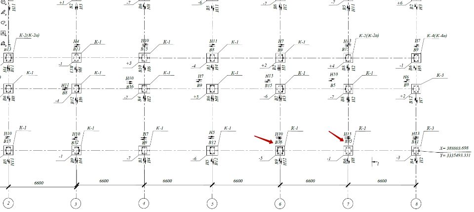 Фрагмент чертежа исполнительной съемки фактически возведенных стальных колонн (нажмите на изображение, чтобы увеличить):